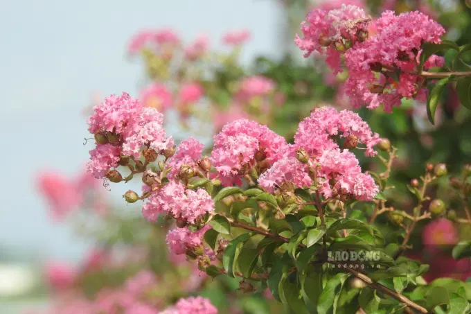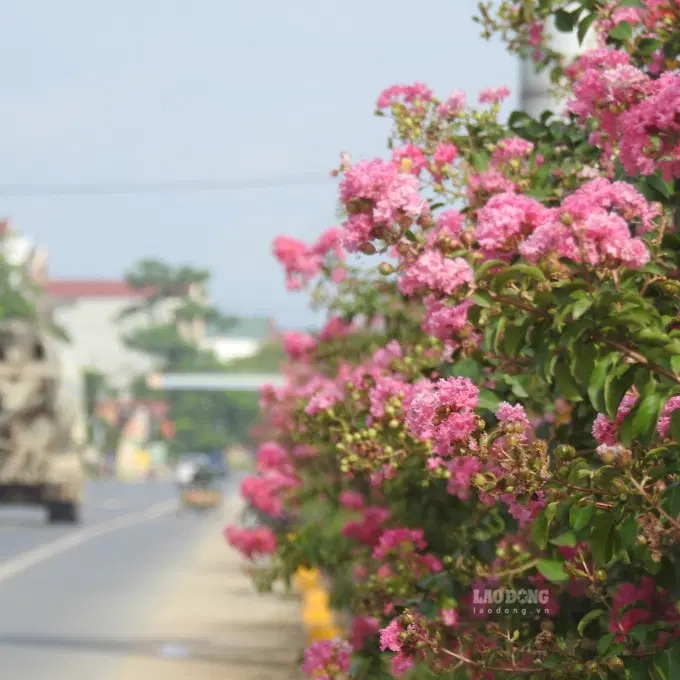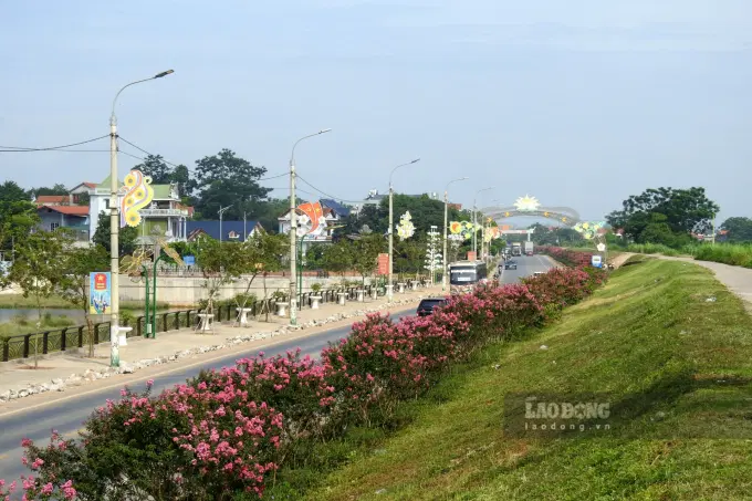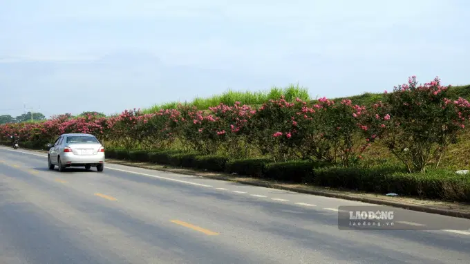 Tuy nhiên, điểm đáng chú ý của tuyến Quốc lộ 32 đoạn qua thị trấn Hưng Hóa trong những ngày đầu tháng 7 này là hàng cây hoa tường vi đang nở rộ, đỏ rực cả một bên đường (phía đê dọc sông Hồng). Ảnh: Tô Công.