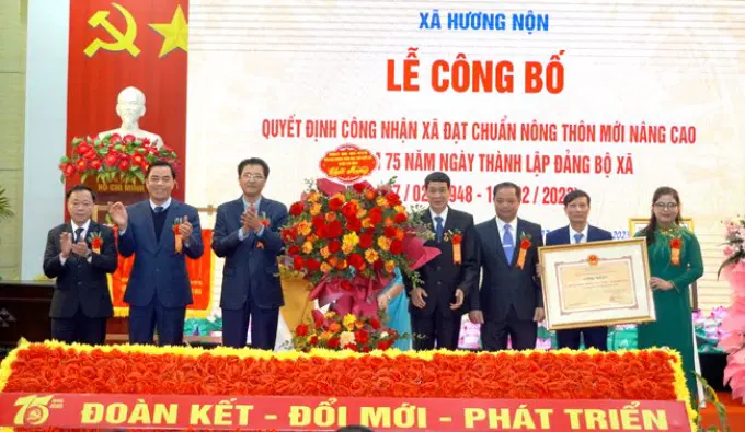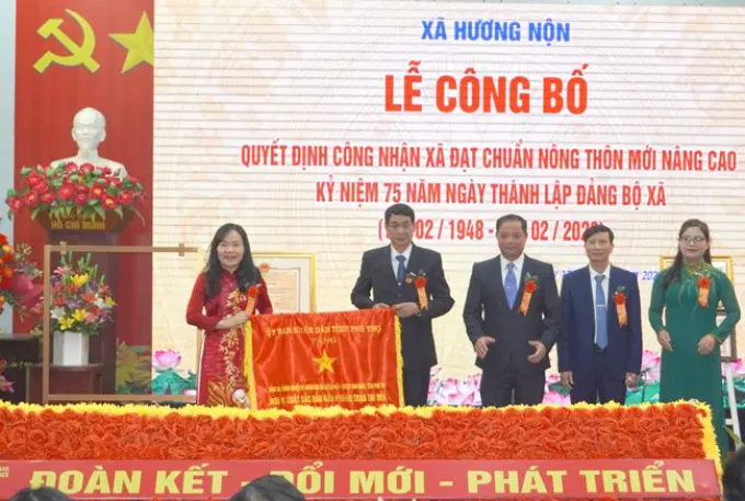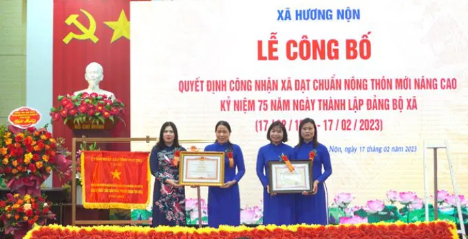 Tại buổi lễ, thừa uỷ quyền của Chủ tịch UBND tỉnh, lãnh đạo huyện Tam Nông trao bằng công nhận xã Hương Nộn đạt chuẩn nông thôn mới nâng cao. Với những kết quả đã đạt được trong năm 2022, đồng chí Nguyễn Thị Thanh Huyền – UVBTV, Trưởng Ban Dân Vận tỉnh uỷ trao Cờ thi đua của UBND tỉnh cho xã Hương Nộn vì đã có thành tích xuất sắc dẫn đầu phong trao thi đua năm 2022.