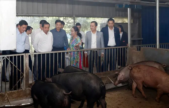 Bộ trưởng Bộ Nông nghiệp và Môi trường Trần Đức Thắng thăm mô hình chăn nuôi an toàn sinh học ở tỉnh Phú Thọ. Ảnh: Bảo Khang.