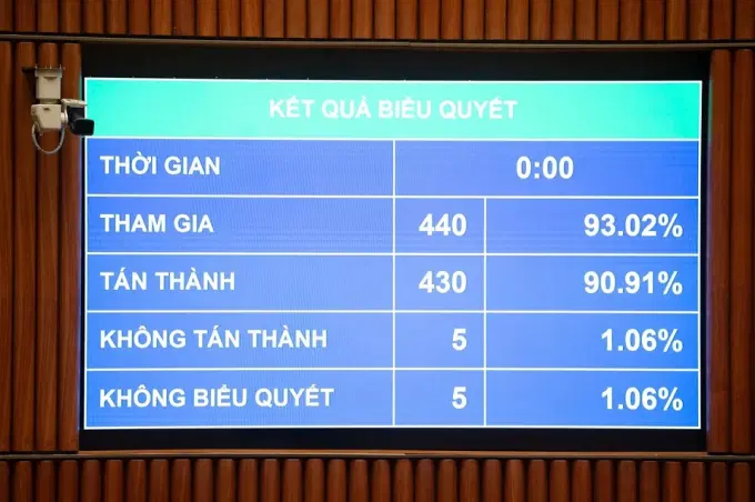 Kết quả biểu quyết điện tử cho thấy có 430/440 đại biểu có mặt tán thành, chiếm 90,91% tổng số đại biểu Quốc hội. Với tỷ lệ tán thành cao, Nghị quyết chính thức được thông qua.