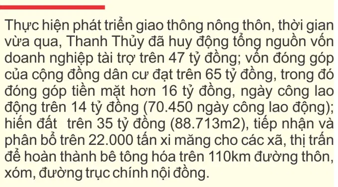 Là đơn vị thứ 2 của tỉnh được công nhận huyện nông thôn mới (NTM), những năm gần đây, với sự quan tâm đầu tư của Nhà nước, hệ thống giao thông nông thôn (GTNT) của huyện Thanh Thủy ngày càng hoàn thiện. Mạng lưới giao thông được mở rộng, các tuyến đường từng bước được cải tạo, nâng cấp, tạo điều kiện thuận lợi cho phát triển kinh tế - xã hội địa phương.