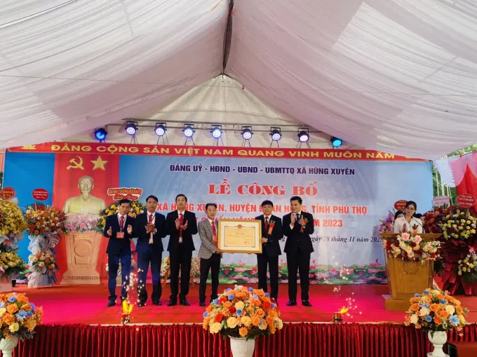 Thừa ủy quyền của Chủ tịch UBND tỉnh, đ/c Lê Văn Phượng - Bí thư Huyện ủy cùng lãnh đạo Thường trực Huyện ủy, HĐND, UBND huyện trao bằng công nhận đạt chuẩn quốc gia xây dựng NTM cho Đảng bộ, Chính quyền và nhân dân xã Hùng Xuyên.
