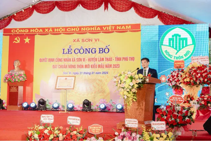 Phát biểu tại buổi lễ, đồng chí Nguyễn Quang Anh - Tỉnh ủy viên, Bí thư Huyện ủy biểu dương, ghi nhận, chúc mừng những kết quả, thành tích mà xã Sơn Vi đã đạt được trong xây dựng nông thôn mới. Đồng thời khẳng định, chương trình xây dựng nông thôn mới là chủ trương đúng, trúng, có ý nghĩa thiết thực của Đảng, Nhà nước và được Nhân dân đồng tình hưởng ứng. Kết quả xây dựng nông thôn mới kiểu mẫu của xã Sơn Vi nói riêng, huyện Lâm Thao nói chung đạt được cho đến nay là thành quả chung tay góp sức của cả hệ thống chính trị trong những năm qua.